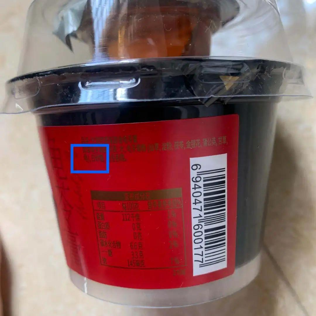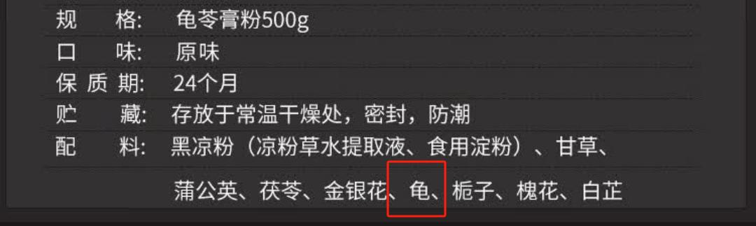 这款龟苓膏的配料表中显示采用的是“龟苓膏粉”,但也注明了“龟苓膏粉”的配料中含有“龟”。