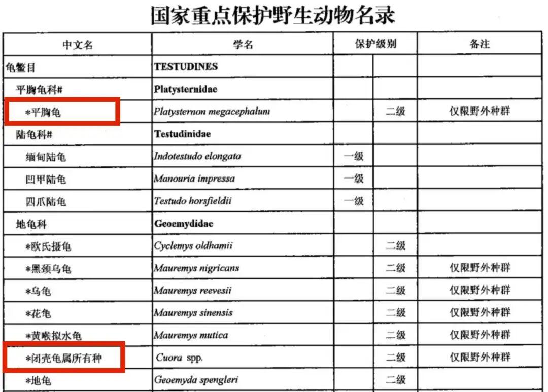 鹰嘴龟又名“平胸龟”,金钱龟为“闭壳龟属所有种”|图源《国家重点保护野生动物名录》截图