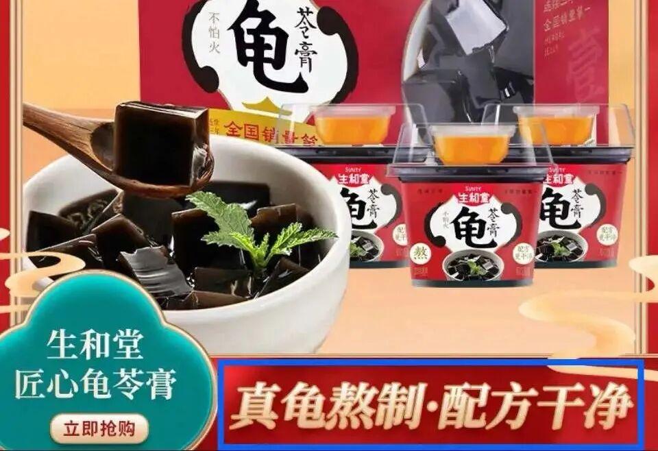 品牌“生和堂”的“匠心龟苓膏”在商品详情页的宣传海报中也写道“真龟熬制·配方干净”。